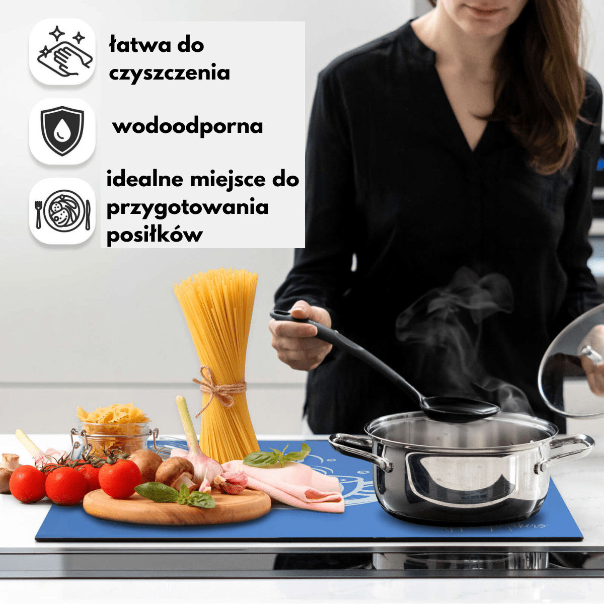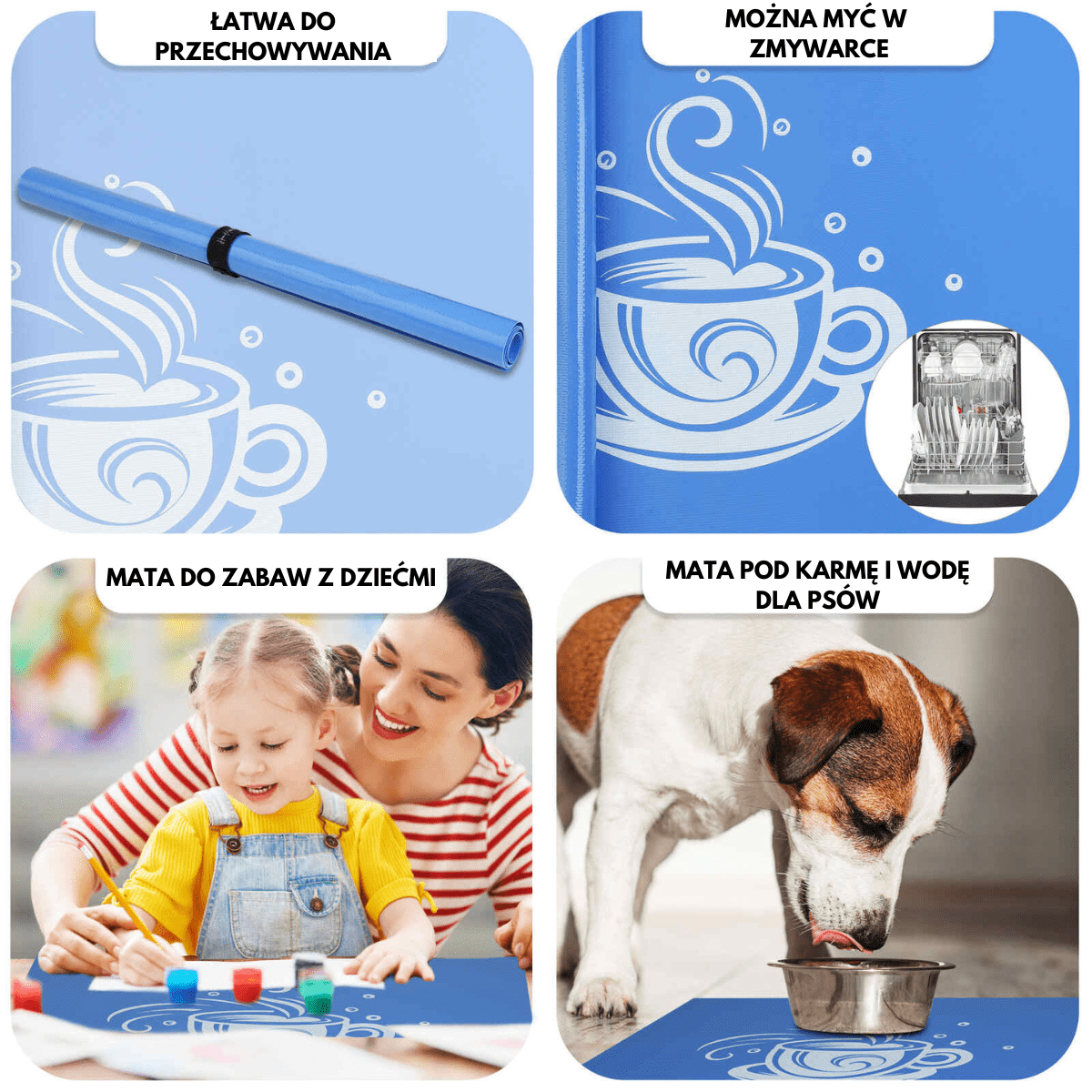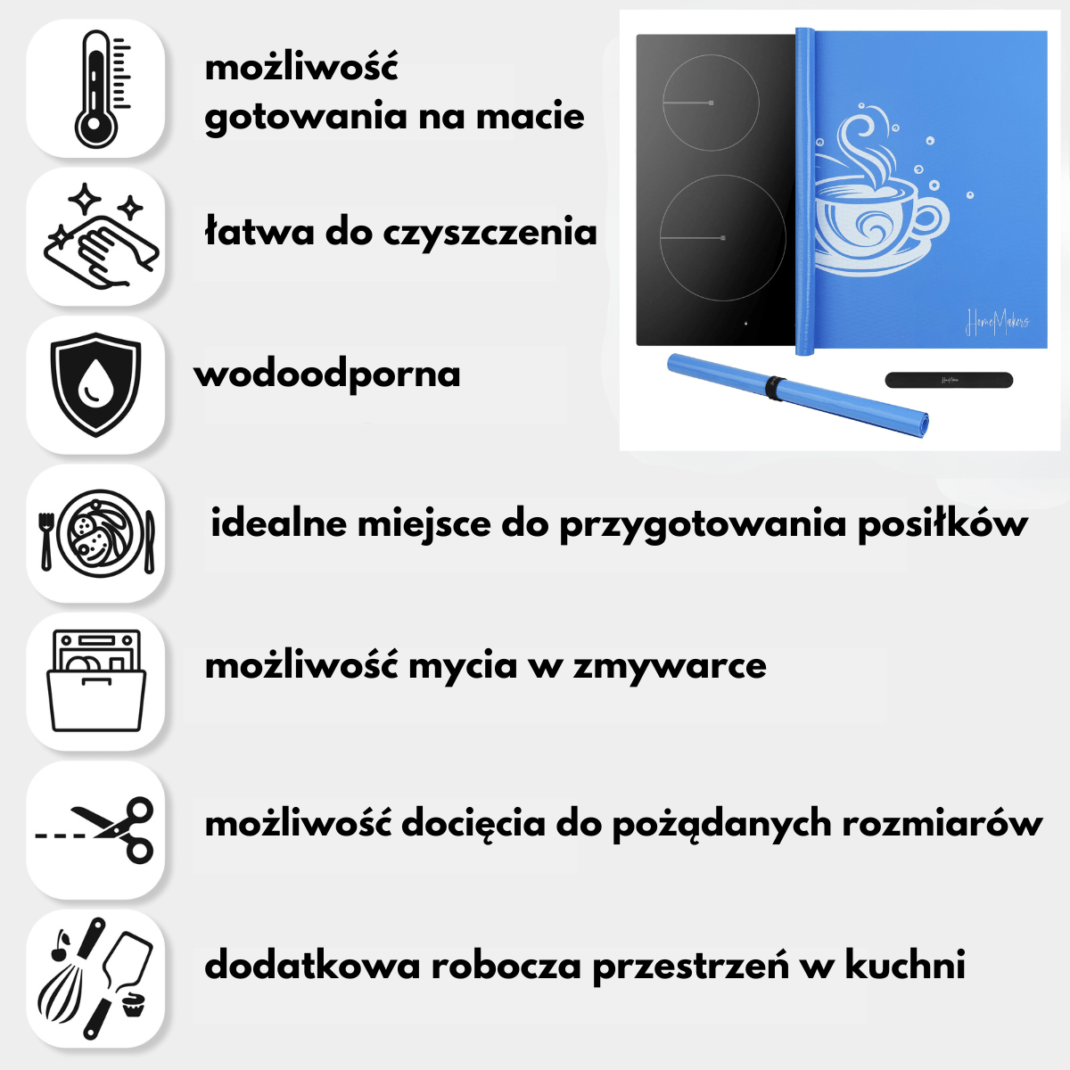 - Różnorodne Użycie: Np. jako mata ochronna na płytę indukcyjną, podkładka do prac plastycznych dla dzieci, mata ochronna pod miejsce do jedzenia dla zwierząt domowych, podkładka pod sprzęty kuchenne jak mikser, mikrofalówka, ekspres do kawy.