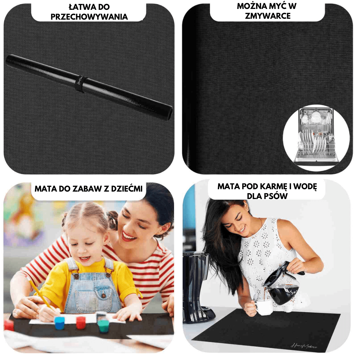 - Różnorodne Użycie: Np. jako mata ochronna na płytę indukcyjną, podkładka do prac plastycznych dla dzieci, mata ochronna pod miejsce do jedzenia dla zwierząt domowych, podkładka pod sprzęty kuchenne jak mikser, mikrofalówka, ekspres do kawy.
